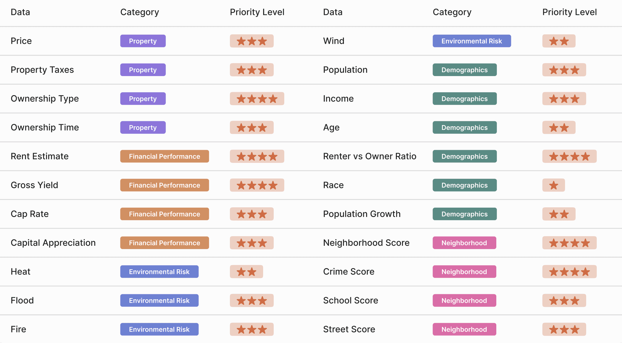 User interviews revealed the most critical data points for property evaluation. I categorized these findings, collaborated with the internal team to assess data availability and implementation effort, then created a prioritization matrix. Features rated 4+ stars (high user value, feasible development) were selected for the MVP launch.